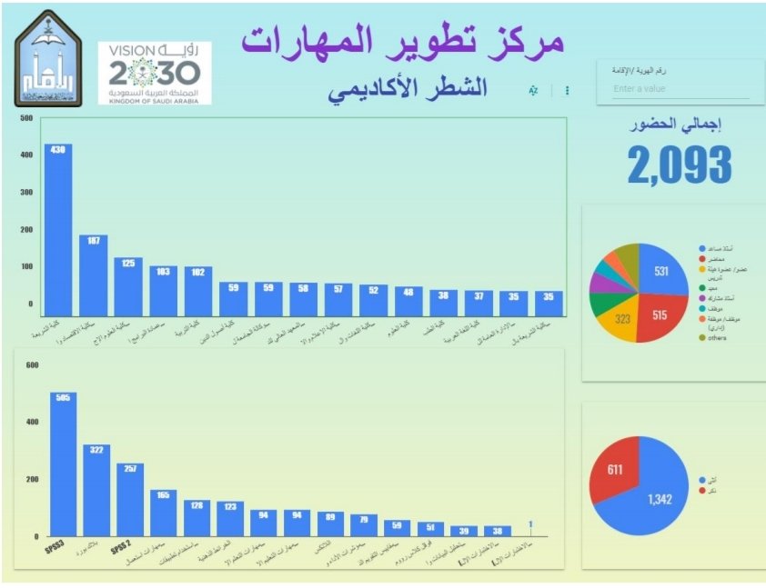 يمكن الاطلاع على احصائيات الحضور للدورات التدريبية الخاصة (بشكل تفاعلي) في الشطر الأكاديمي بالضغط على الرسومات البيانية من خلال الدخول على الرابط التالي: datastudio.google.com