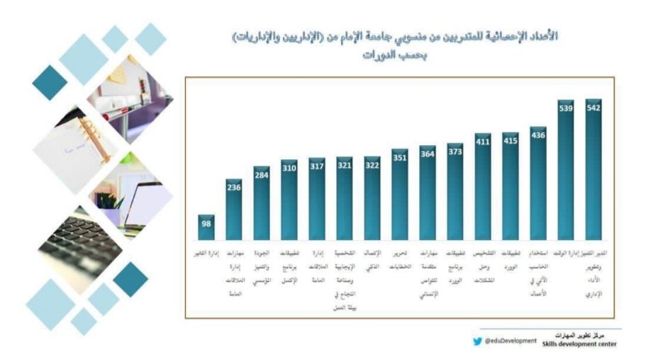 عرض لإنجازات #مركز_تطوير_المهارات #جامعة_الإمام للفصل الدراسي الثاني للعام الجامعي 1442هـ، حيث بلغ عدد الدورات المقدمة 55 دورة تدريبية. قُدم منها 25 دورة للشطر الأكاديمي، و30 دورة للشطر الإداري.