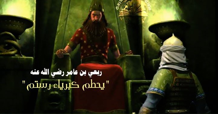 "ربعي" : إن رسول الله قد سنَّ لنا أن لا نمكن آذاننا من الأعداء، وألا نؤخرهم عند اللقاء أكثر من ثلاث (أي ثلاثة أيام فقط حتى لا يتمكنوا منا ويتداركوا أمرهم)، فإني أعطيك ثلاثة أيام بعدها؛ اختر الإسلام ونرجع عنك أو الجزية،