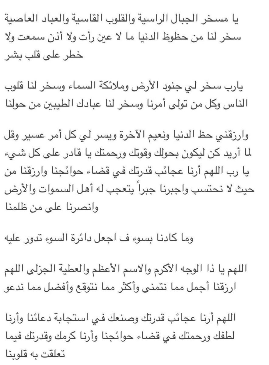 "اللّهم ارزقني رزق لم أتوقعه، وخير لم أفكر به، وتحقيق أمنيات ظننت يوما أنها مستحيلة، واستجابة دعوات أكررها دائما .. ربي وفقني، سخّر لي، بشرني، أرح بالي وقلبي، أسعدني، اعفو عني، ارحمني، قر عيني، أرض عني، هب لي ما أتمنى وما أريد يا ذا الجلال والإكرام".