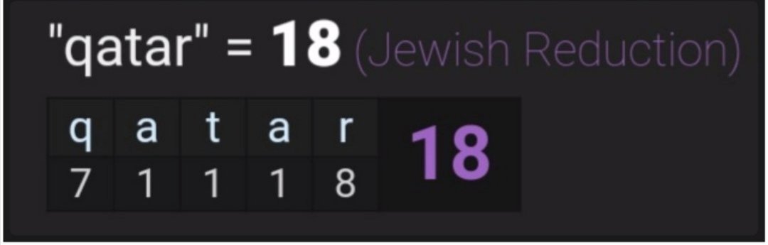 تاريخ إعلان فوز قطر بالتنظيم "2010/12/2 " = (8) وشهر " ديسمبر " في الجمتريا اليهودية بأنواعها الثلاثة يوصلك أيضاً للرقم (8) تخليك تشك إن فيه علاقة مخفية لكن هذه المعادلة ما ترتبط بقطر أو أي دولة غيرها وحتى الشعار ممكن ترسمه أي دولة على شكل "8" لأنه واضح إن الشعار محدد مسبقاً !