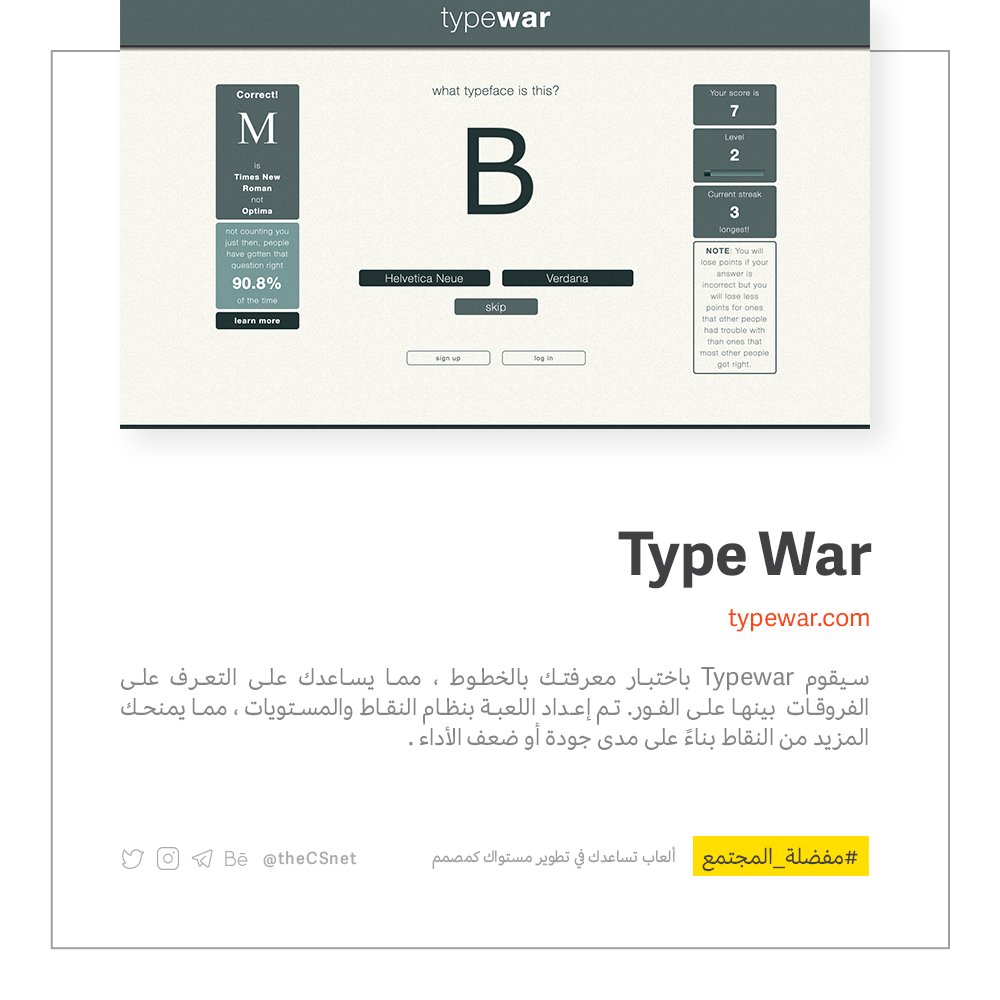 سيقوم Typewar باختبار معرفتك بالخطوط ، مما يساعدك على التعرف على الفروقات بينها على الفور. تم إعداد اللعبة بنظام النقاط والمستويات ، مما يمنحك المزيد من النقاط بناءً على مدى جودة أو ضعف الأداء .