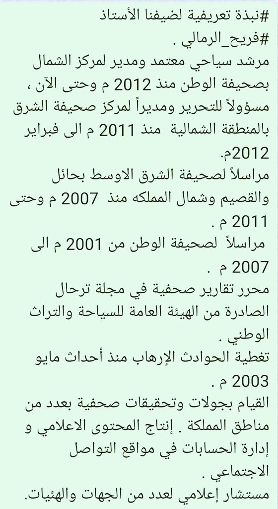 شكرا لضيفي العزيز والغالي الأستاذ القدير فريح الرمالي على تواجدك وتجاوبك معنا في هذه الفقرة كان لقاء ثري وممتع مع قامة صحفية 🌹🌹..