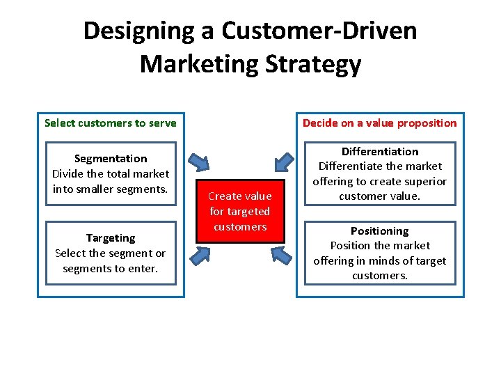 في التسويق المدفوع بالعملاء ، يجب تصميم المزيج التسويقي ليناسب كل شريحة من العملاء وفقا للمعلومات التي تم جمعها في البحث التسويقي ، في حين أن التسويق التقليدي سيركز على استهداف أكبر قاعدة عملاء بالمزيج التسويقي