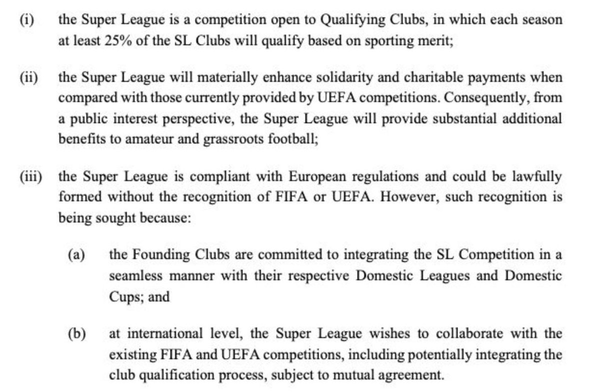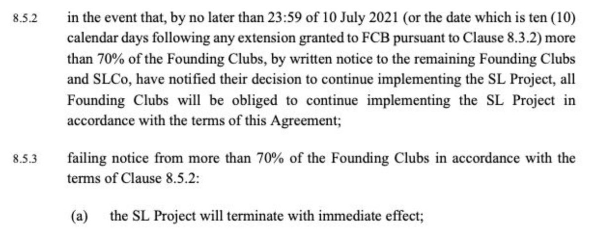 حالة انهاء العقد بدون غرامات تصبح سارية أيضا في حالة اتفقت الأندية المؤسسة مع الويفا أو الفيفا على صيغة جديدة للبطولات الأوروبية ترضيهم (الأندية الكبيرة)
