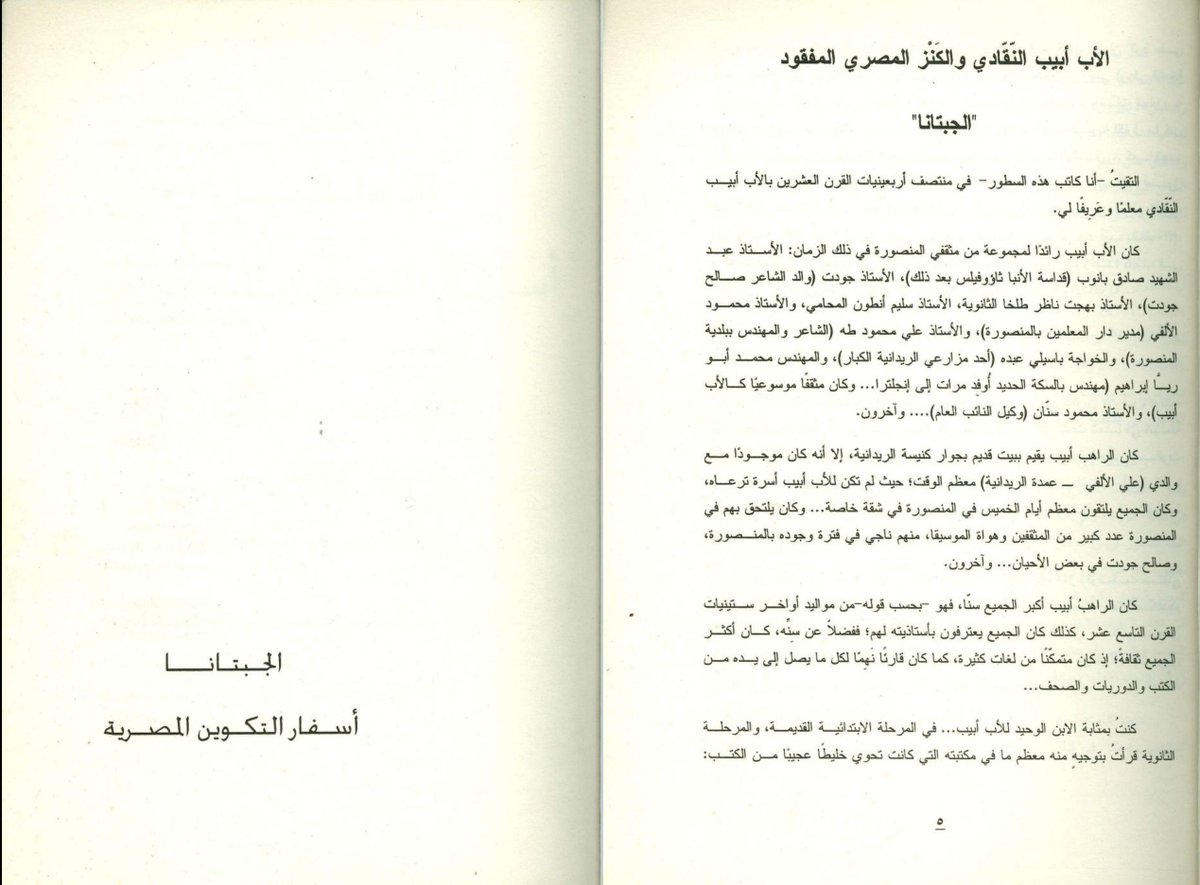 ثم يزيد الطين بلة فينسب عنوانه الجذاب الجبتانا ذو النجار اليونانية والبعيد عن الأصالة المصرية، إلى الأب أبيب النقادي الذي قضى نحبه ولن نتمكن من التثبت مما يزعمه الألفي وينسبه إليه.! ثم نجد عنوانا فرعيا "أسفار التكوين المصرية" تهود به كل فرعون عظيم رغما عن أنفه!