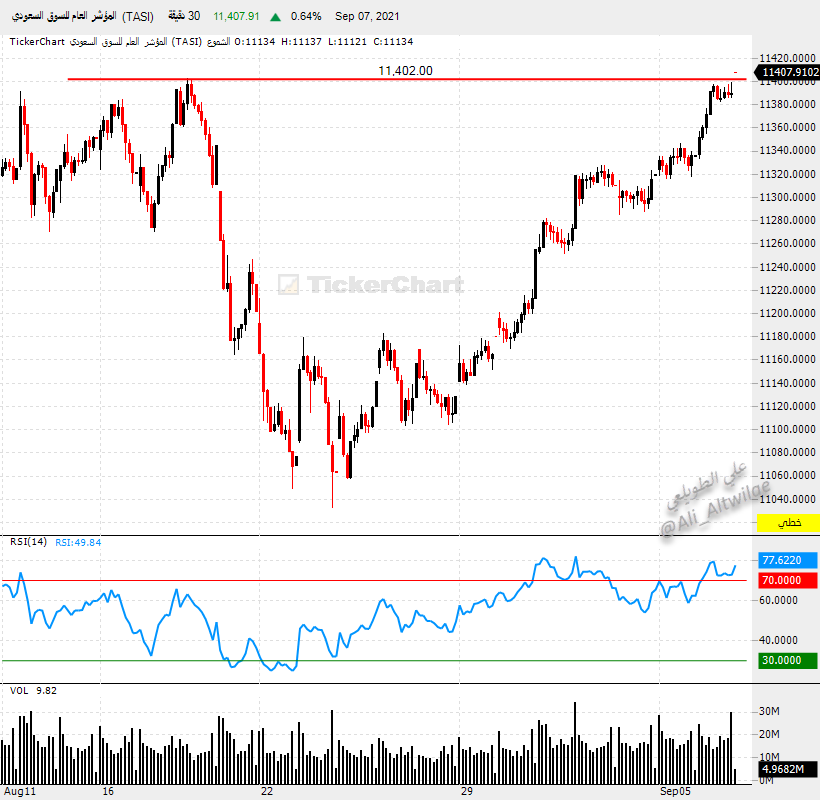 أغلق المؤشر العام #تاسي فوق مستويات 11,400 وبذلك نُرجح ان يستمر تصاعده في الايام الى مستويات الهدف الثالث 11,482