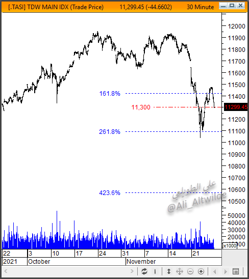 تراجع المؤشر العام #تاسي اليوم الى مستويات الدعم الذي تم تحديده مسبقا على الرسم البياني عند 11,100