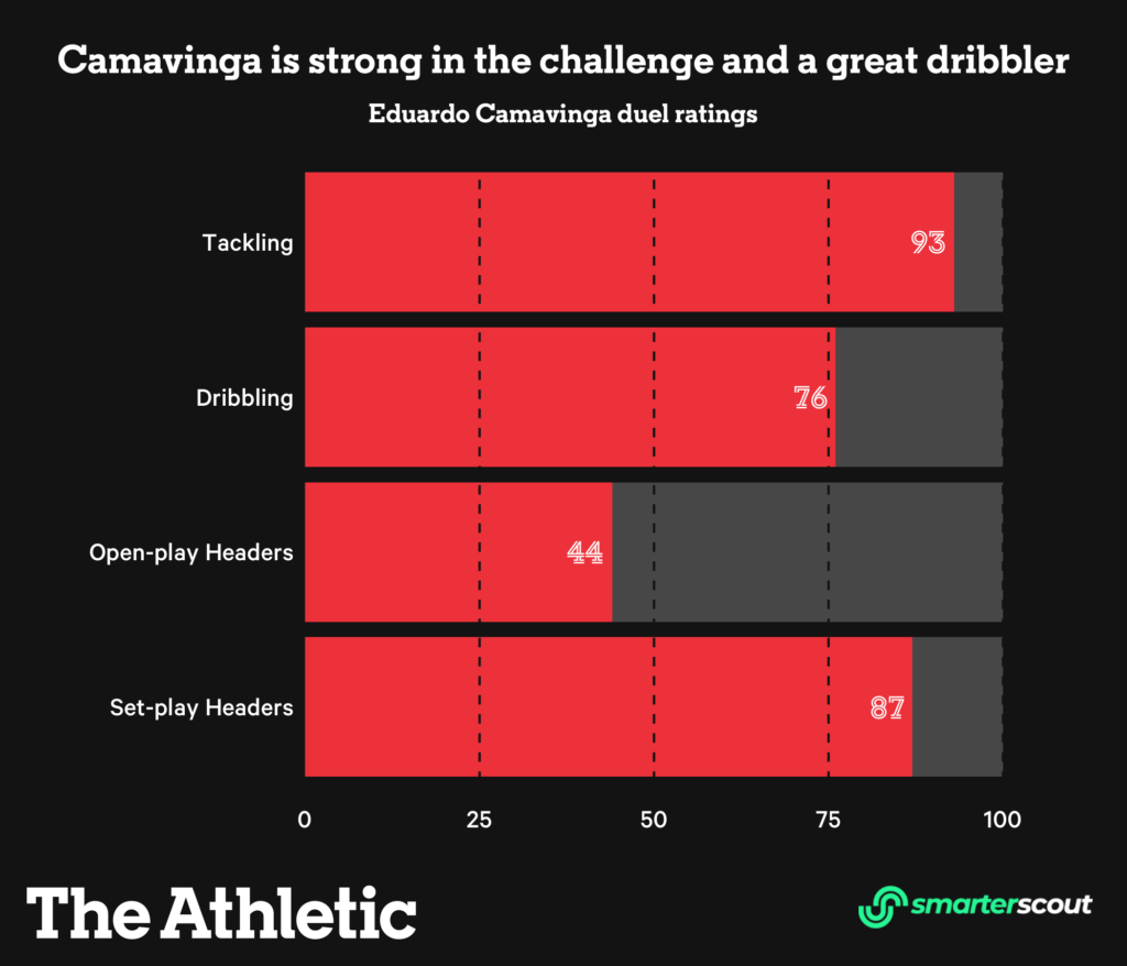 هناك أمثلة أخرى لا حصر لها من لعبة الاسترداد هذه ، والتي تقطع شوطًا طويلاً لتوضيح سبب قوة تصنيف كامافينجا حسب smarterscout لـ "التأثير الدفاعي" 66 من 99، فهو يمنع الخصم من تقدم الكرة ويفرض دورانًا منتظمًا في اللعب.