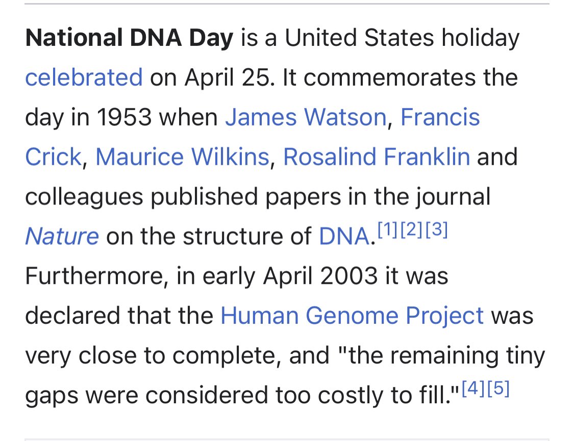 ٢-مر هذا اليوم بتطورات أولاً كان يحتفل به في امريكا بمناسبة اكتشاف كريك و اتسون و غيرها و بعدها تم الاحتفال بمناسبة اكتمال #الجينوم_البشري وفي عام ٢٠١٢ تم اعلانه ٢٥ ابريل يوماً عالمياً للاحتفال بال 🧬🧬