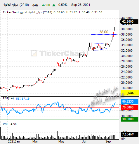 تحرك ممتاز لسهم #سبكيم بإغلاقه اليوم عند مستويات 34.10 بإعتقادي أن الموجه الحالية للسهم مازالت تستهدف الصعود لمستويات 36 ليحقق بذلك عندها قمة شهرية متوقعة
