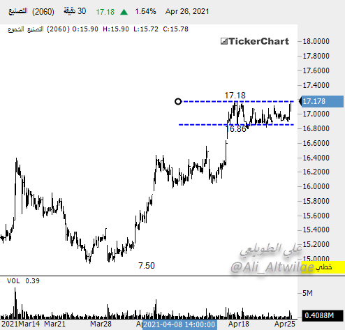 سهم #التصنيع أرتد بنهاية تدوالات الخميس من مستويات 20.26 والتي تمثل مناطق دعوم كما يظهر في الرسم البياني بقاء السهم فوق تلك المستويات يرجح له عودته للصعود وتجاوز مستويات قمته السابقة