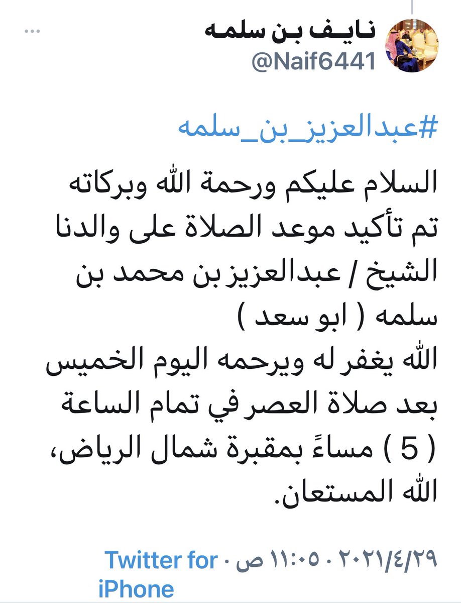 وسيُصلّى عليه بمقبرة شمال الرياض عصر اليوم (الساعة ٤) إن شاء الله تعالى.