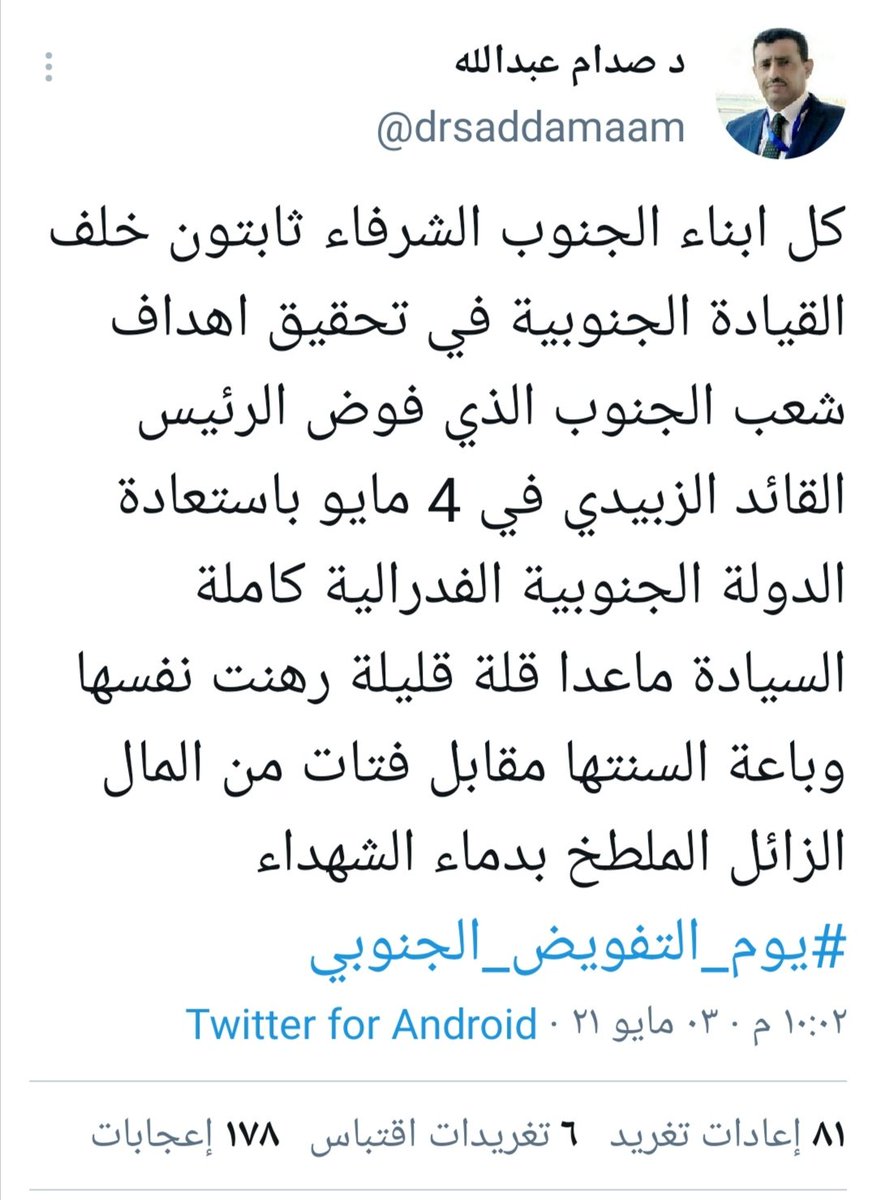 هذا د.صدام عبدالله المستشار الإعلامي للأستاذ عيدروس الزبيدي رئيس المجلس الانتقالي"يتحدث هنا عن طرف جنوبي آخر ويعتبر هذا من ضمن عرّابي الإعلام والخطاب ويتهم الآخرين بالفتات،