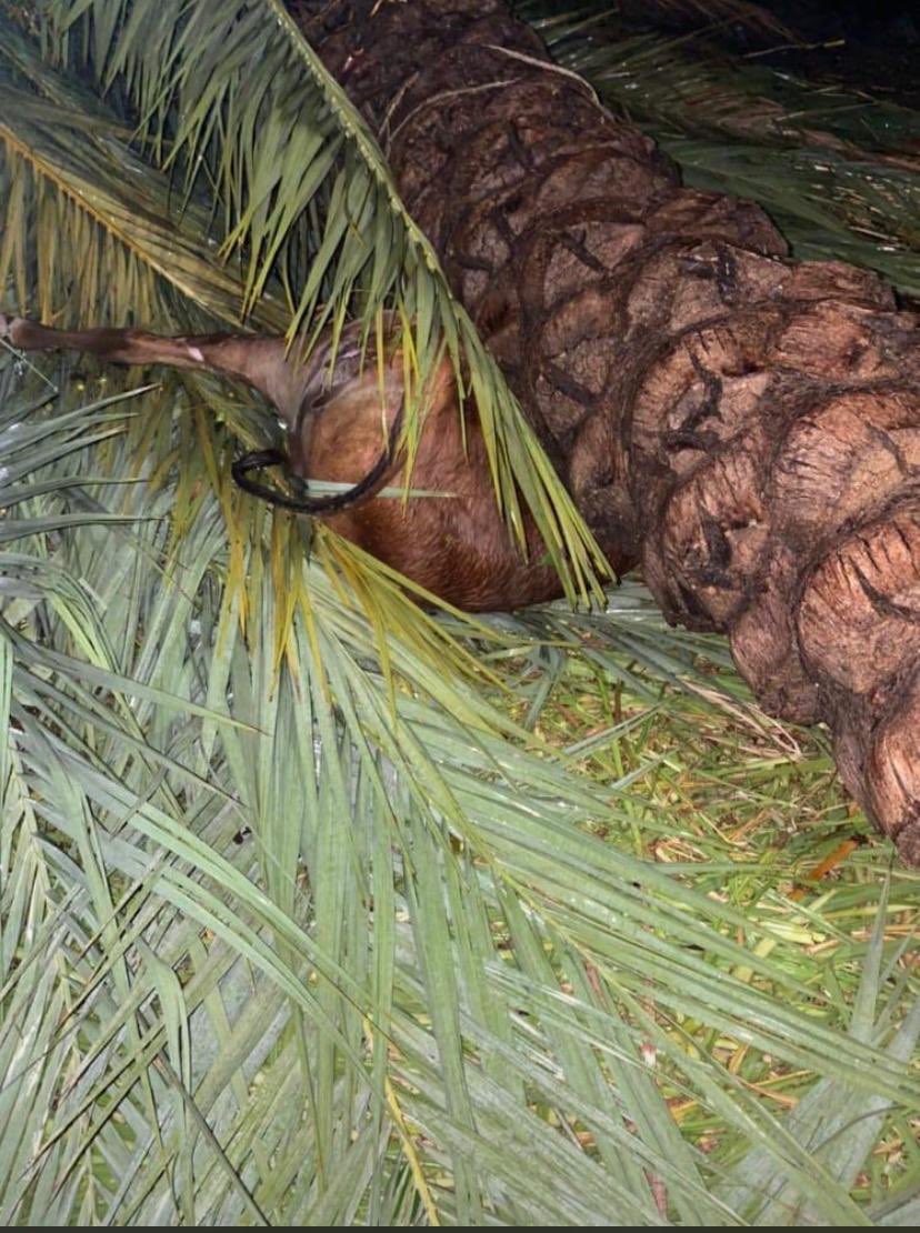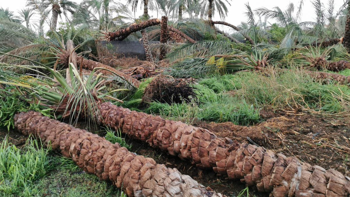 المئات من أشجار النخيل تساقطت على امتداد قرى صحم، الخابورة والسويق، وبعضها سقط على الجدران فهدمتها وعلى المواشي، مقطع يبين جانب من ضياع كبير لأشجار النخيل بصحم