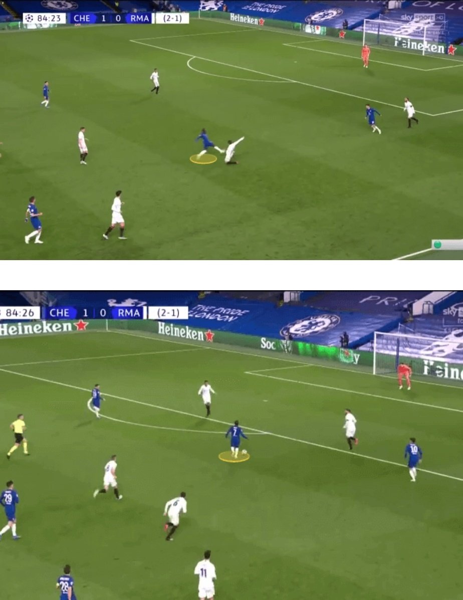 هذا لأن كانتي نادرا ما قدم مساهمات هجومية حاسمة على هذا المستوى، في هذه المرحلة. لم يكن الفرنسي أبدًا لاعب خط وسط دفاعي بحت، لكن مساهمته في المضي قدمًا كانت محدودة.
