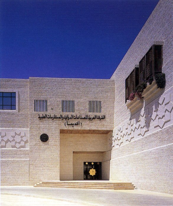 مبنى الشركة العربية للصناعات الدوائية و الطبية ويتكون من ثلاثة طوابق. فراغات المكاتب مجمعة حول فناء مركزي محاط بعنصرين للحركة الرأسية في نهايات المسقط . الواجهة مكسوة بالحجر المحلي.