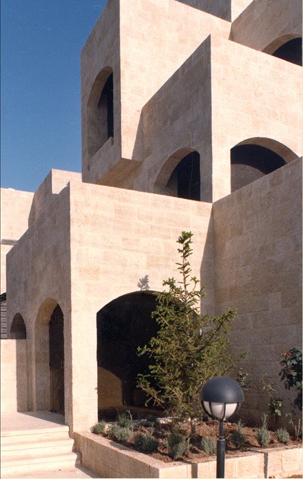 الجدران الخارجية حجرية خشنة مائلة بزاوية ناعمة وكتل بسيطة. مصدر الإلهام من مدرجات الأراضي في عمان.