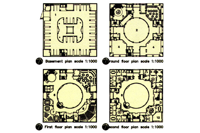 المباني وضعت بزاوية 45 درجة مع وجود فناء داخلي بها لضمان الحركة والإضاءة الداخلية في المبنى. كما ربط هذه المباني بمحاور حركة ومرور للمشاة والمركبات.