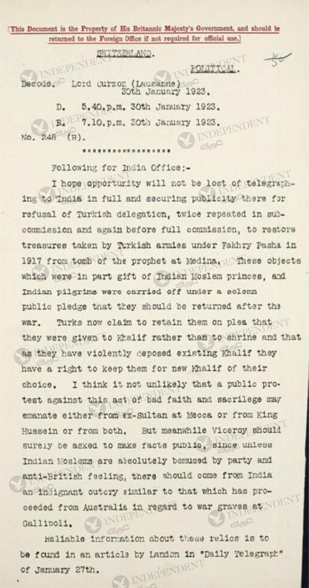 18-وكان يعتقد أن الآثار النبوية ستعود يوما ما بعد الحرب إلى مكانها الأصلي إلا أن التقلبات السياسية وزوال الدولة العثمانية وغيرها من التطورات حالت دون ذلك في وقت اعتبرت فيه الدولة التركية الحديثة أن الكنوز النبوية هي جزء من إرثها التاريخي المملوك لجميع المسلمين 👇
