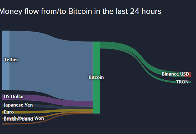 11. الشكل التالي يوضح أن حوالي 80% من عمليات الشراء في البتكوين كانت عبر عملة "التثر" خلال الـ24 ساعة الماضية. وتشير الدراسات أن حوالي 65-70% من اجمالي عمليات شراء البتكوين تاريخيا تتم عبر التثر.