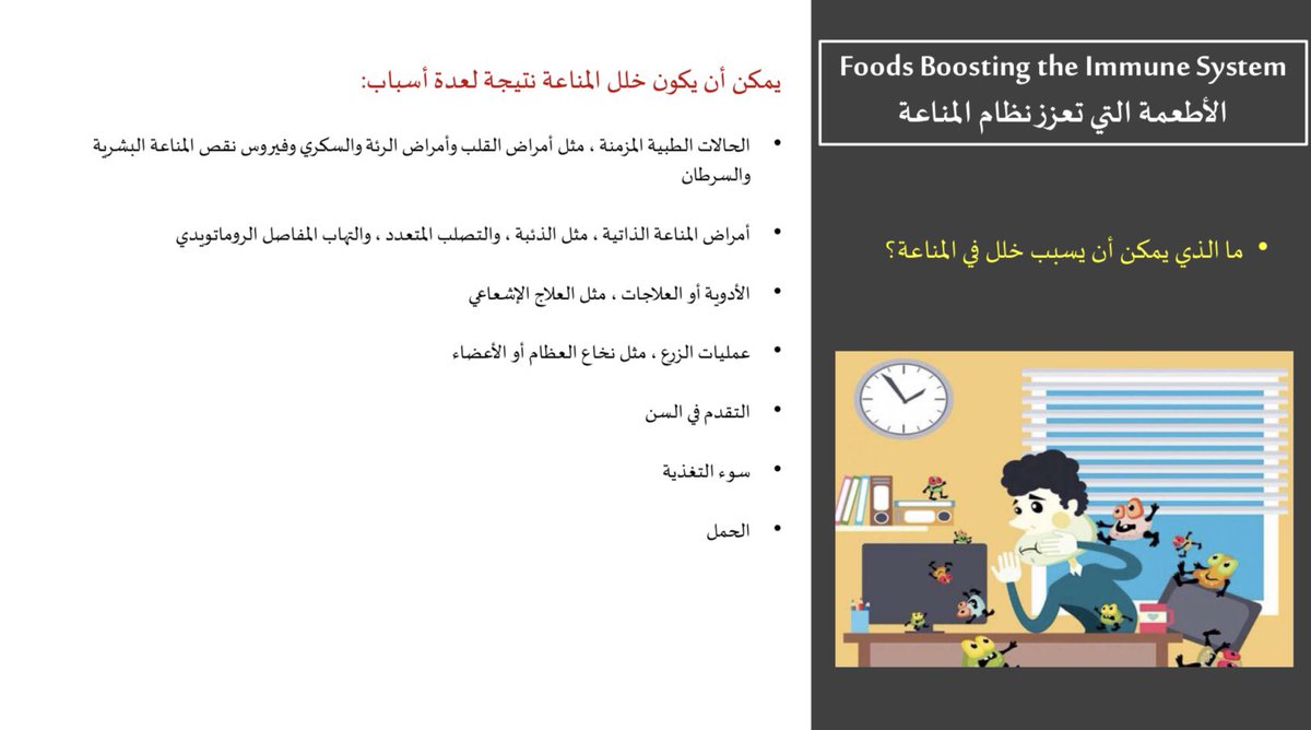 بعض انواع الاغذية المعززة للمناعة ومعلومات عنها موجودة في الشرائح المرفقة مع التغريدات