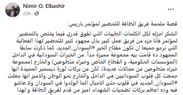كل الناس شافت الشغل الكبير الاشتغلوها فريق وزارة الطاقة بقيادة بروف نمر وباقي الشباب السوداني الواعد في التحضير لمؤتمر باريس (أنا عامل اسكرين شوت للبوست بتاع بروف نمر في البوست) وممكن تلقوا رابط البوست الكامل في التعليقات. المجموعة دي عبارة عن مجموعة استشارية متطوعة من