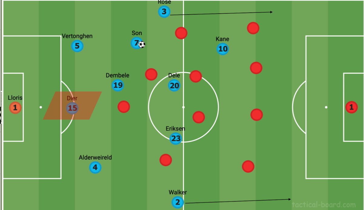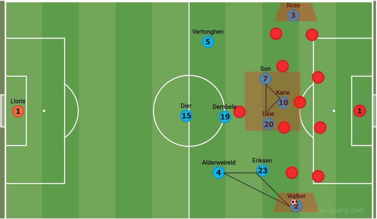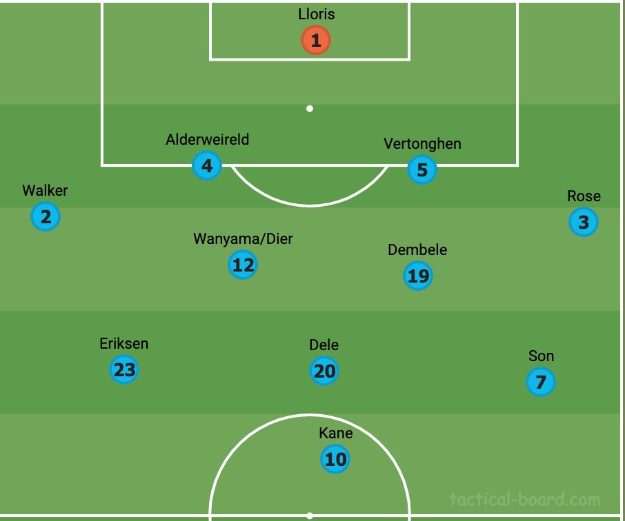 نادرا ما كان توتنهام يحمل شكل حقيقي عندما يكون فاقد الكرة. الهدف هو إغلاق اللاعب الموجود على الكرة ف (سون ، ديلي ، كين) بقصد استعادة الكرة مرة أخرى في المواضع الخطرة ومنع الخصم من اكتساب إيقاع في اللعب المتراكم.