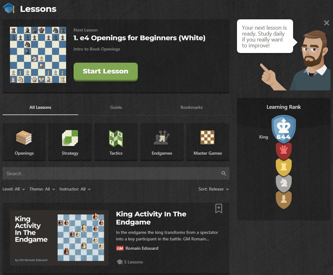 تحتوي العضوية المجانية من الموقع على موارد كبيرة حتى للّاعبين ذوي الخبرة. يمكنك تنزيل كتب الشطرنج المجانية من الموقع ، وممارسة التكتيكات و الافتتاحيات و النهايات.
