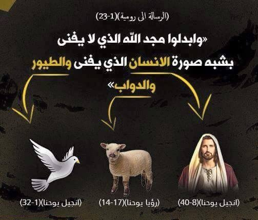 23)وأبدلوا مجد الله الذي لا يفنى بشبه صورة الإنسان الذي يفنى (يسوع) والطيور (الروح القدس) والدواب (الخروف)