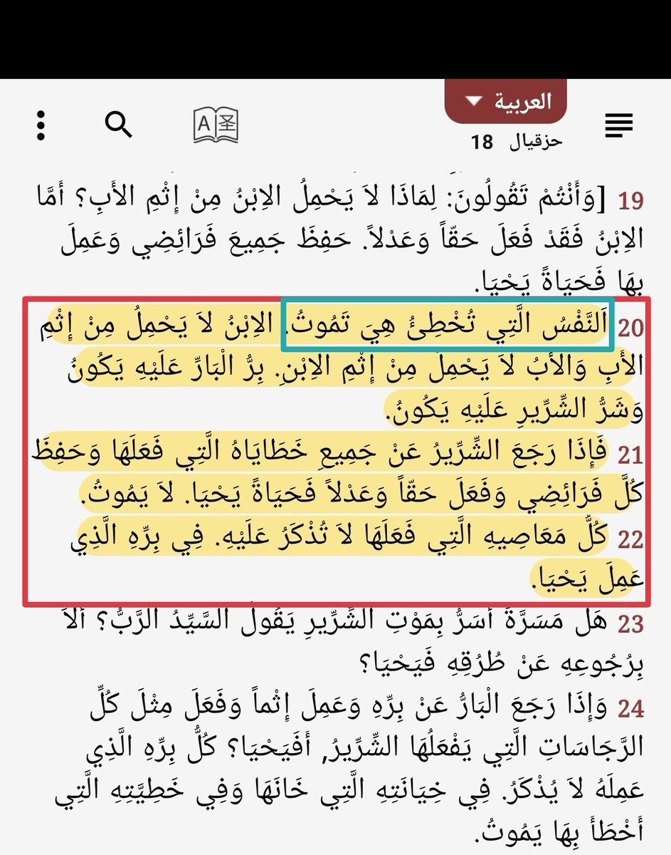 20)النفس التي تخطئ هي تموت الابن لايحمل من اثم ابيه والاب لايحمل من اثم الابن بر البار عليه يكون وشر الشرير عليه يكون