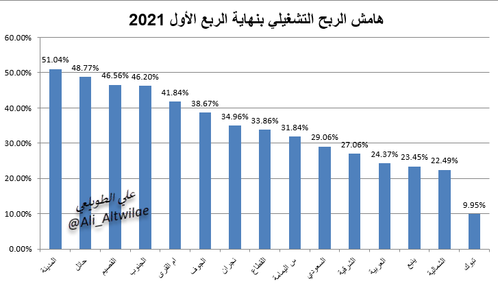 يعطي قياس لنسبة الأرباح التي حققتها الشركة من نشاطها الرئيسي تم ترتيبها في الرسم ادناه حسب الأفضل مقارنة بأداء قطاع شركات الاسمنت بنهاية الربع الأول 2021 من اليسار لليمين.