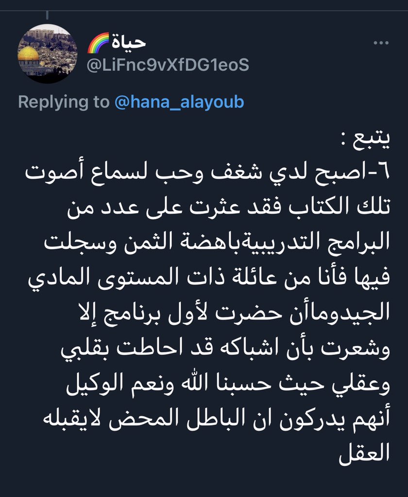 ويشاءالله تعالى أن يستجيب لأختنا دعاءهاالصادق بأن يريها الحق ويرزقها اتباعه،فاستجاب الله تعالى وكشف لها الخداع الطاقي الذي تعج به مواقع التواصل الاجتماعي من دورات ولقاءات ومقالات ومقاطع تلبست بتنمية الذات وماهي في حقيقتها إلا امتهانًا للذات وضياعًا لها..