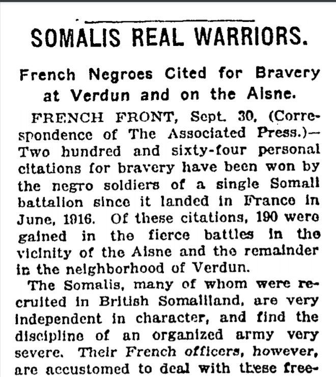 ويمكننا رؤية مشاركة الجندي الصومالي في معارك الحرب #العالمية_الأولى في الكثير من القصاصات الصحفية ومنها هذه المؤرخة بتاريخ 4 نوفمبر 1917م والمعنونة " الصوماليين محاربين حقيقيين ! " تتحدث عن عدد الميداليات الاستثنائية التي أعطيت للجنود الصوماليين في معركتي فردان وAlsne عام 1916م
