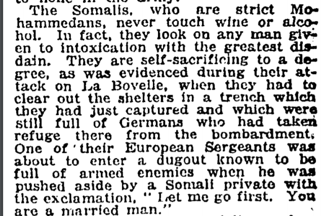 #خلاصة القصاصة الأولى المؤرشفة 1930 والثانية 1917م رفض العمال البيض العنصريين للبحارة الصوماليين (وقت السلام) بينما في #وقت_الحرب نرى الكتيبة الصومالية البريطانية تشارك (عبثاً) في معركة فردان الشهيرة ونرى حسن أخلاقهم مع الأسير الألماني وشجاعتهم المفرطة