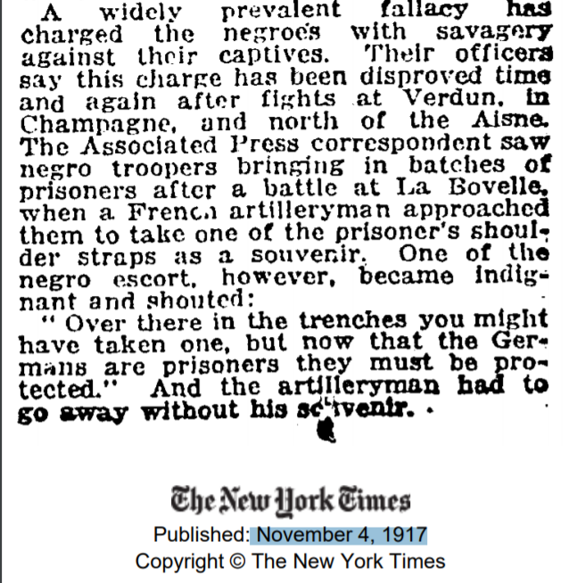 الجزء 4 من القصاصة كتب المراسل ما يشبه الاعتراف وقال توجد #مغالطة منتشرة عن همجية "الافارقة" مع الأسرى وقد كذب الضباط هذه المغالطة وذكروا في كل المعارك كانوا مثالاُ على حسن المعاملة، وذكر قصة مسلح فرنسي أراد أخد قطعة من أسير ألماني فصرخ عليه أفريقي في ساحة الحرب لك ذلك لكن هنا لا