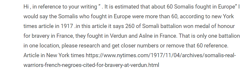 ومن الطرائف الدكتورة التي كتبت مقالاً عن معرض #الجنود الصوماليين المنسيين في الحروب البريطانية ذكرت عدد الجنود الصوماليين كانوا (60 مقاتل في كل معارك أوربا) فصححها شاب وقال اين تذهبين من الخبر الصحفي الذي يعود تاريخه لعام 1917م والقائل عدد الأوسمة في معركتين كانت 264 وسام