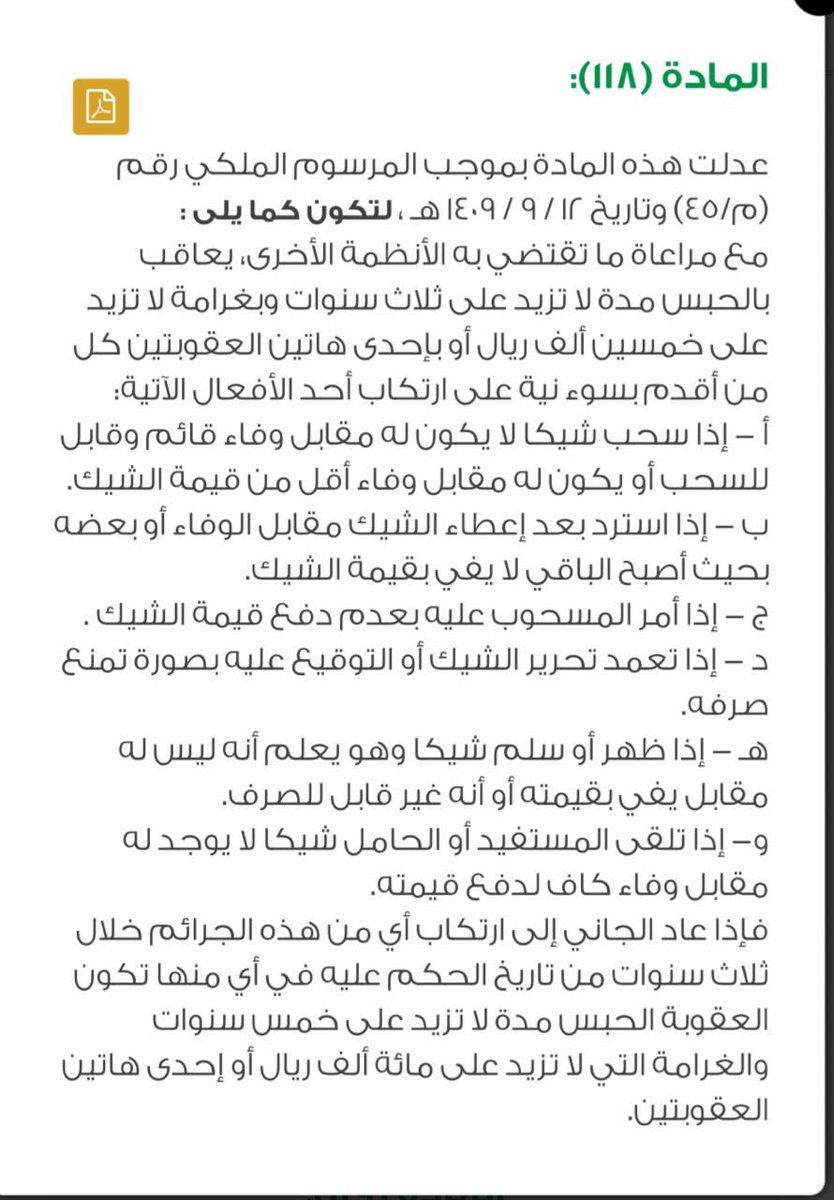 ٨٨- الشيك المقيد في الحساب: أجازت المادة (١١٣) من نظام #الأوراق_التجارية لساحب الشيك أو حامله أن يضيف إليه بياناً يمنع صرفه نقداً للحامل أو المظهر إليه؛ وذلك بكتابة عبارة (للقيد في الحساب) أو أيّة عبارة تفيد نفس المعنى.