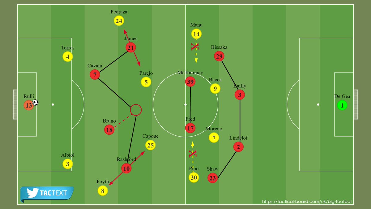 هذا الأمر يقودنا للحديث عن إمكانية البدء بجيمس لمحاولة استغلال سرعته في التحرك في المساحة خلف دفاع فياريال وضرورة تواجد راشفورد على اليسار وبالتالي عدم البدء ببوغبا