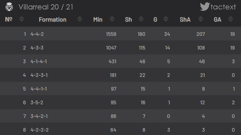 📸 توزيع عدد دقائق لعب فياريال بحسب الرسم التكتيكي للفريق هذا الموسم | المصدر: understat.com