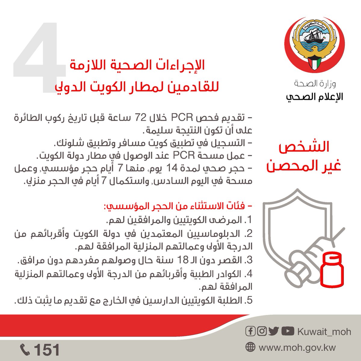 4- الإجراءات الصحية اللازمة للقادمين لمطار الكويت الدولي - الشخص الغير محصن