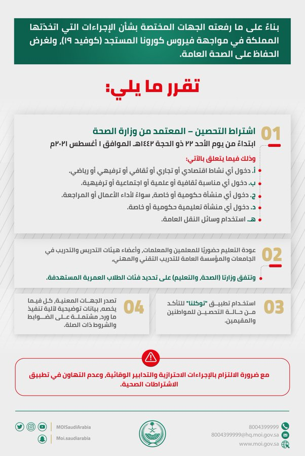 ينص على أن شرط التمكين من دخول المرافق العامة أو الخاصة هو الحصول على (جرعة اللقاح)