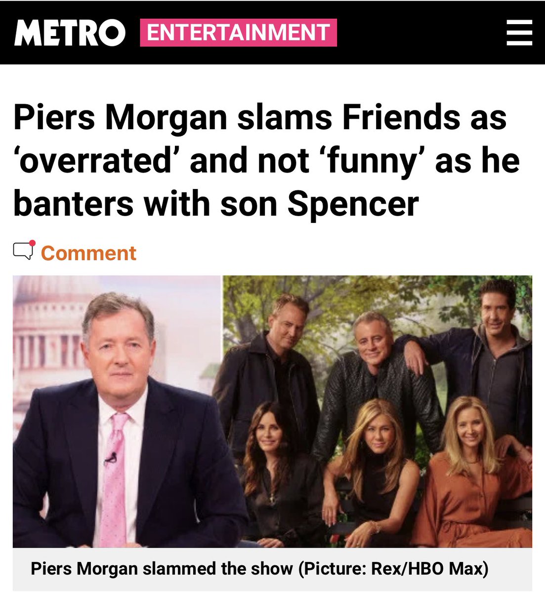 "مسلسل فريندز أكثر مسلسل أخذ أكبر من حجمه في تاريخ الانتاج التلفزيوني وماهو كوميدي" - هذا تعليق الناقد البريطاني الشهير بيرس مورقان وبعد هذا التصريح تناقلته الأخبار البريطانية والامريكية تزامنًا مع الحلقة الاستثنائية