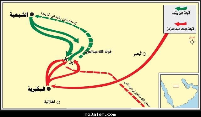 -بدا ابن رشيد زحفه نحو بريدة حتى وصل الشيحية بجانب البكيرية فعلم ابن سعود بهذا و توجه الى البصر ثم الى البكيرية حتى اصبح في مواجهة خصمه و بدا القتال بين الطرفين⚔️
