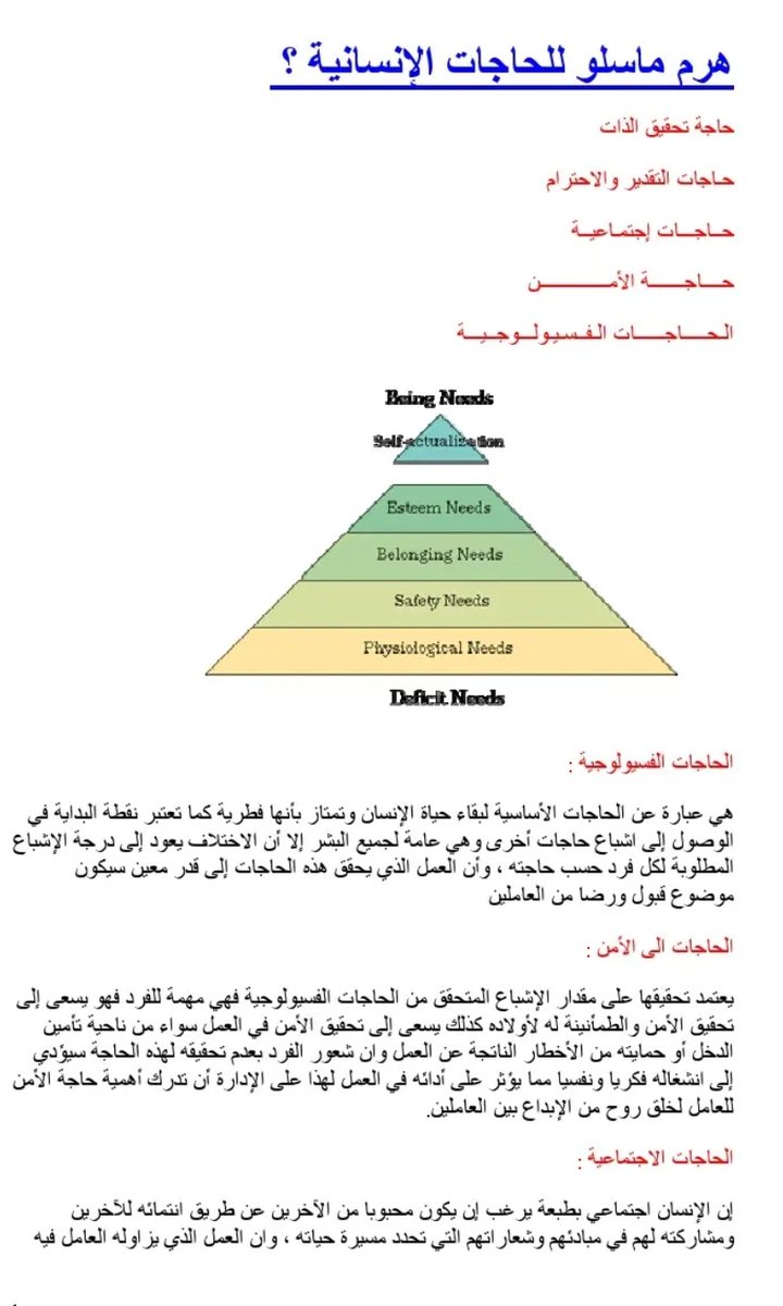 هرم ماسلو هي نظريه ابتكرها عالم النفس ابراهام ماسلو، تقول بان هناك ٥ مستويات لاحتياجات الانسان تحفز تصرفاته، تبدأ من المستوى الاول(الحاجات الفسيولوجية) وحتى الخامس(تحقيق الذات).