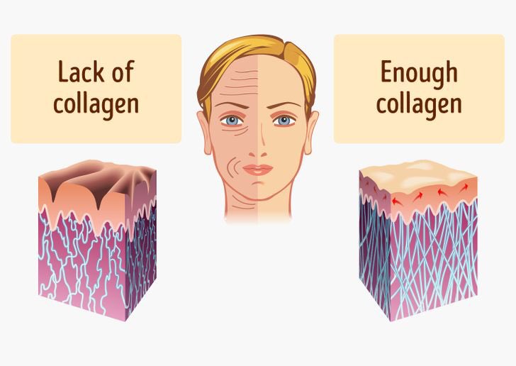 ⁃التعرض للملوثات و الجفاف يفقد البشره مرونتها ويجعلها اكبر سناً. يساعد الكولاجين في زيادة ترطيب البشرة وتحسين مرونة الجلد ، مما قد يساعد في تقليل التجاعيد وجعل البشرة تبدو أصغر سنًا. 🧏♀️🧏 ⬅️