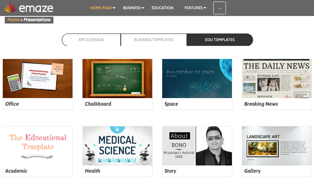 المميز في الموقع وهو مايجعله أفضل من برنامج بوربوينت هو إنه يوفر العديد من الأشكال والنماذج التي يمكنك العمل عليها مباشرة وبشكل سريع فهناك تصميمات مخصصة للتعليم او للأعمال او تصميمات المميز .. الخ