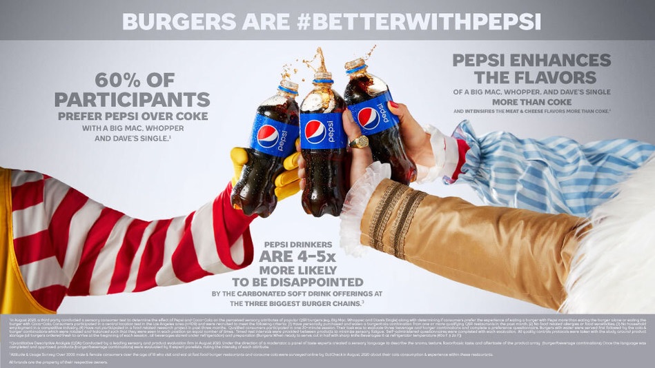 1.)احتفلت شركة Pepsi بذكرى #NationalBurgerDay يوم الجمعة (27 مايو)، باستخدام تغليف من مطاعم الوجبات السريعة KFC و McDonald's و Wendy's حيث يظهر شعار Pepsi بالصدفة. كل ذلك لتوضيح أن مشروبها يتناسب بشكل طبيعي مع البرغر.