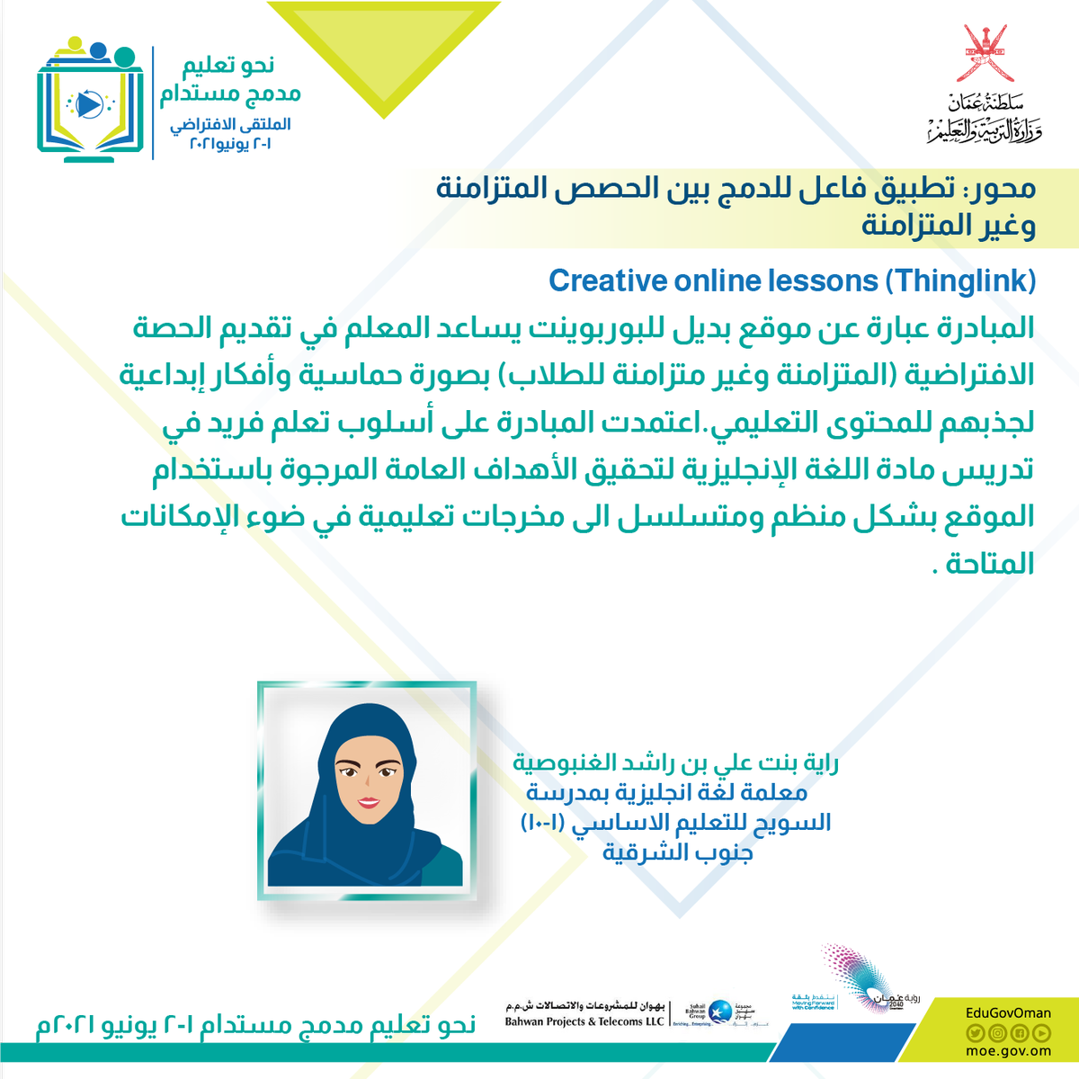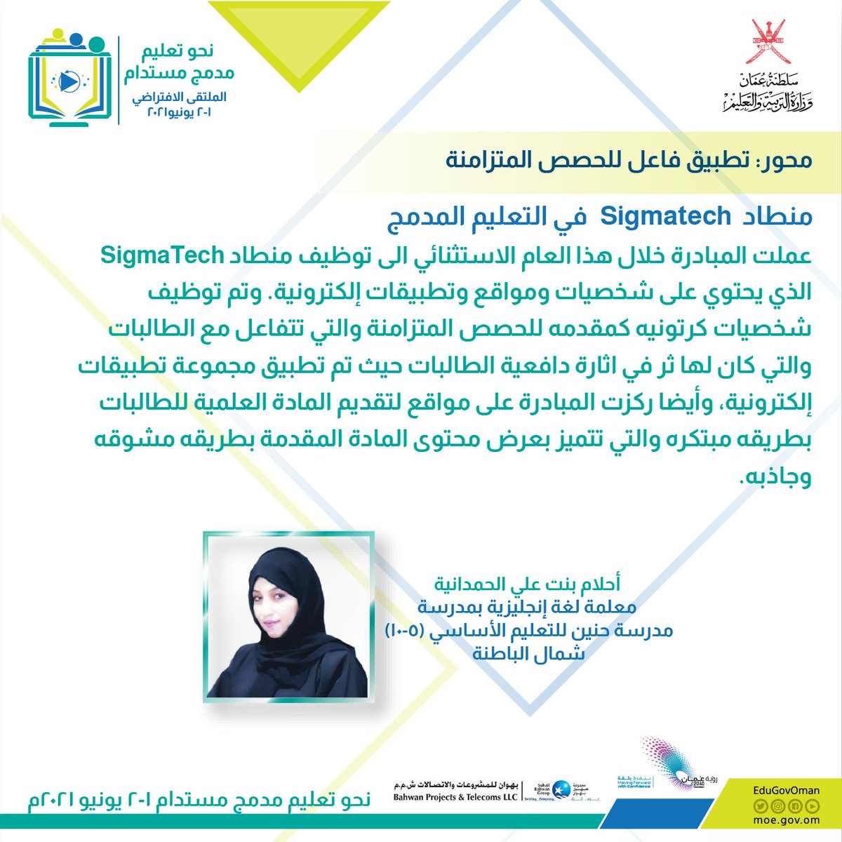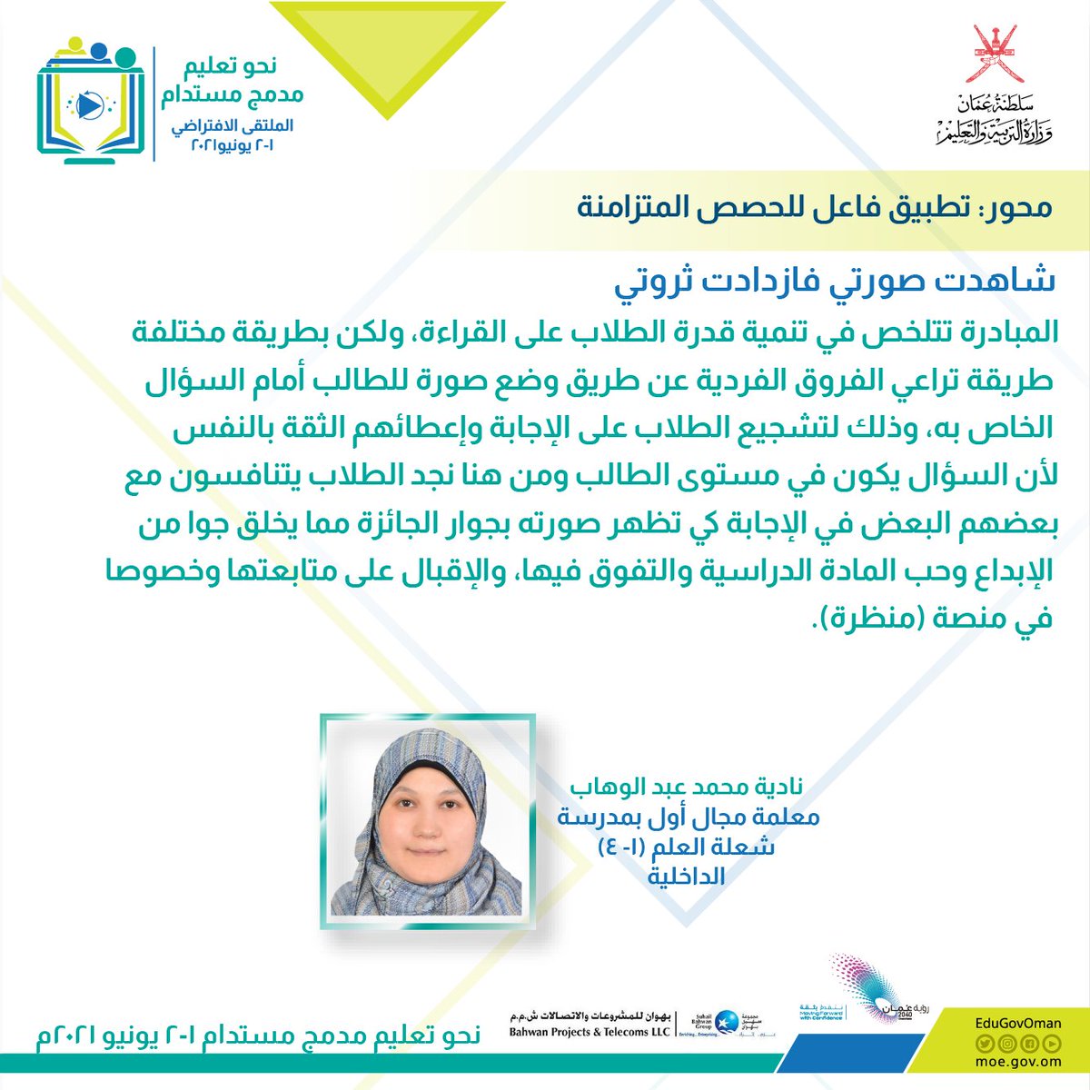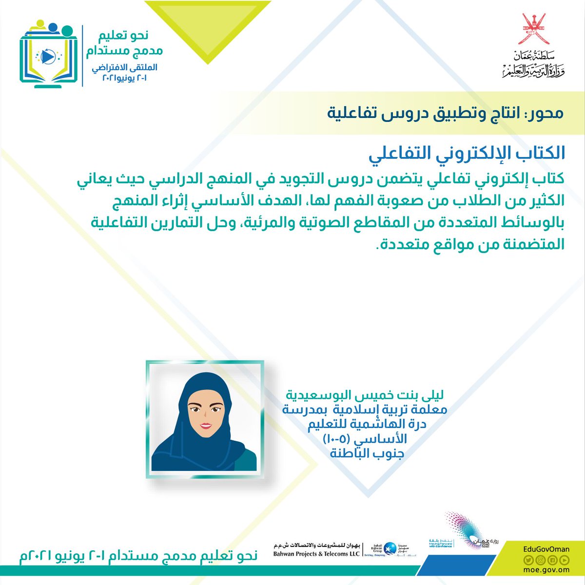 ضمن الجلسة المسائية 1 يونيو 2021 بالملتقى التربوي الافتراضي لمبادرات المعلمين الفاعلة في التعلم عن بُعد الأول #نحو_تعليم_مدمج_مستدام