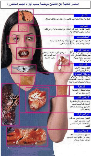 الصورة جدا معبرة وتوضح الامراض التي تصيب الإنسان من إدمانه على التدخين.